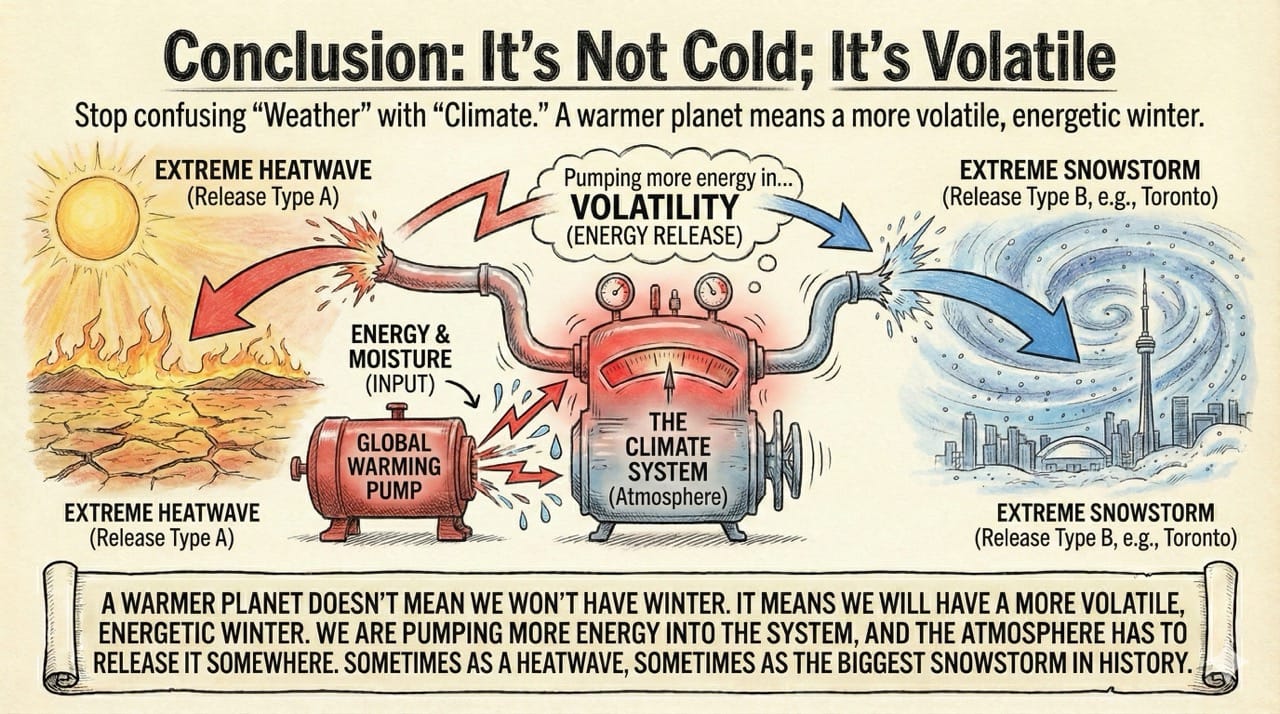 A warmer planet doesn't mean we won't have winter. It means we will have a more volatile, energetic winter. We are pumping more energy into the system, and the atmosphere has to release it somewhere.