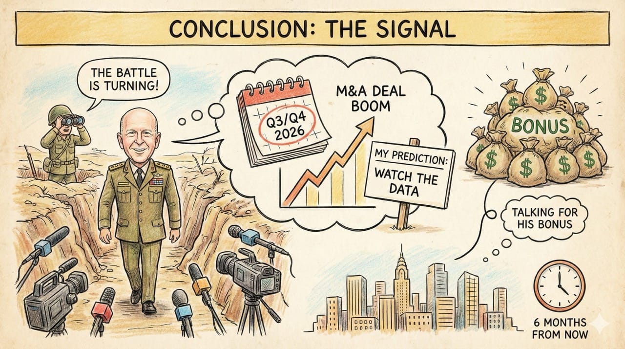 My Prediction: Watch the M&A data 6 months from now. The surge in Solomon’s podcast appearances is a leading indicator for a massive Q3/Q4 deal boom. He isn't talking for his health; he's talking for his bonus.
