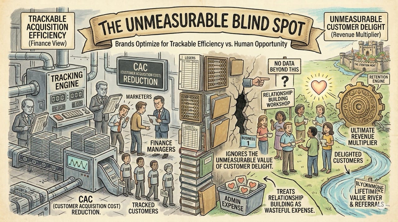 Finance departments force marketers to hyperoptimize customer acquisition costs while completely ignoring the unmeasurable value of customer delight.