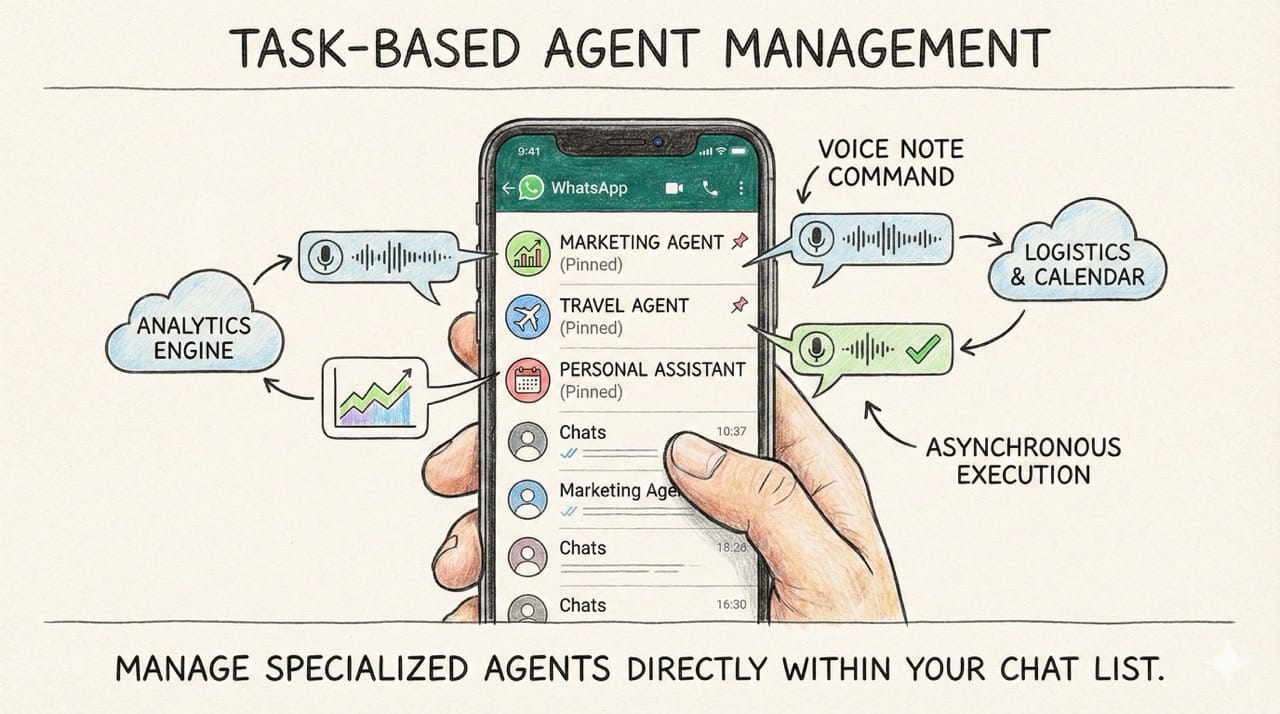 You will simply manage different specialized agents directly within your WhatsApp chat list.