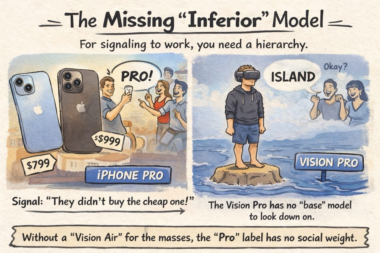 The Vision Pro has no "base" model to look down on. It is an island. Without a "Vision Air" for the masses, the "Pro" label has no social weight.