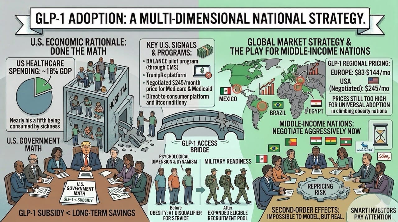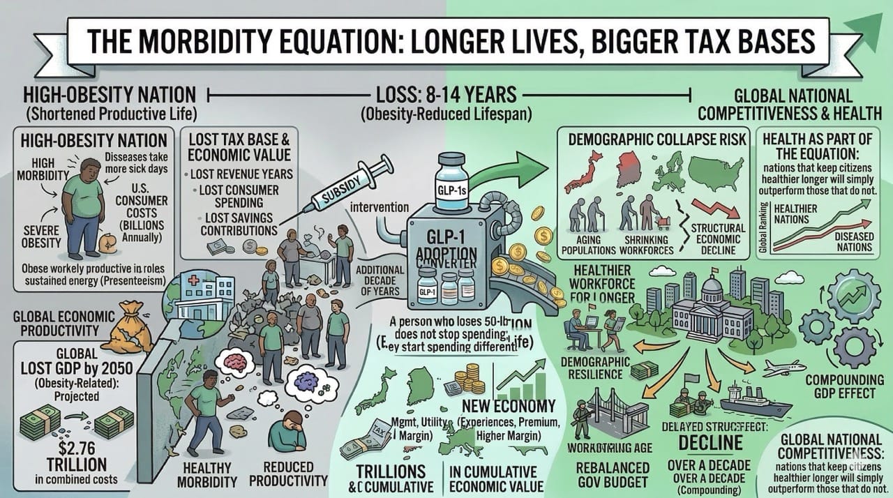 Countries with high obesity rates are sitting on a trillion-dollar arbitrage opportunity. Subsidizing GLP-1 medications is not a healthcare expense. It is a macroeconomic investment that will lower morbidity, boost productivity, and fundamentally restructure consumer spending patterns for decades.