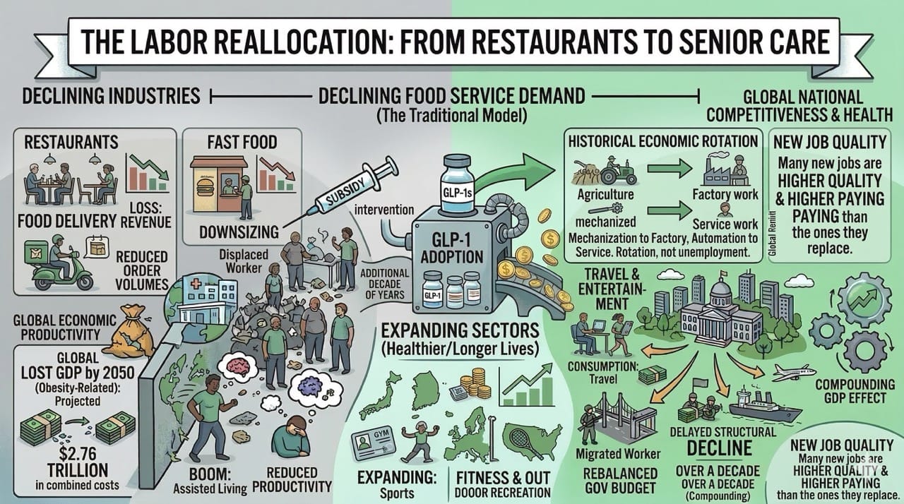 When food consumption declines due to GLP-1 adoption, workers will move to entertainment, wellness, and elder care.