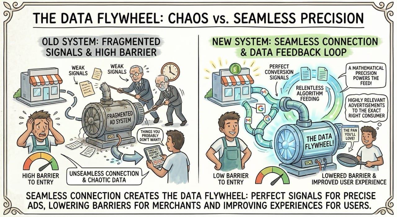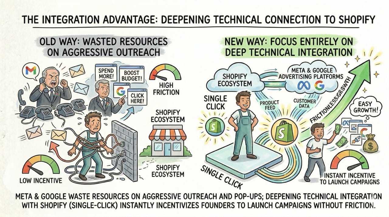 Aggressive sales outreach and platform pop-ups are highly inefficient ways to increase ad spend. The true growth engine is a completely seamless data integration with the world's largest digital storefront builder.